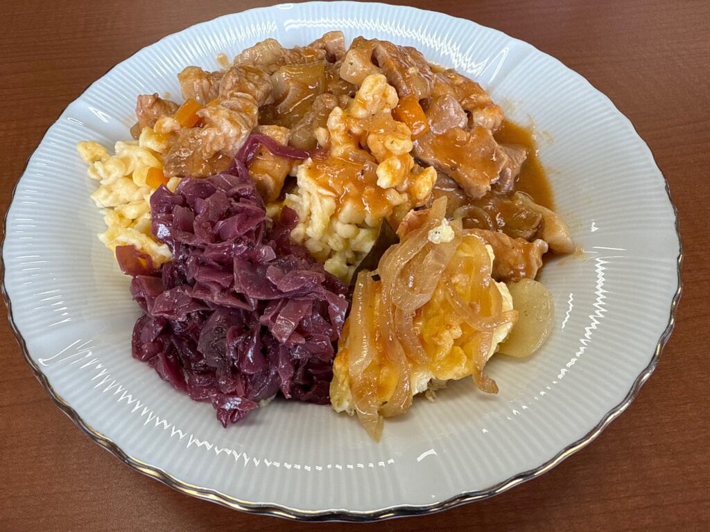 German cuinsie ・Steu (goulash)German eggnoodles (Spätzle)German dumpling (Knödel) redcabbage (Blaukraut) ・Pancakes with apple sauce(Kaiserschmarrnwith Apfelmus)